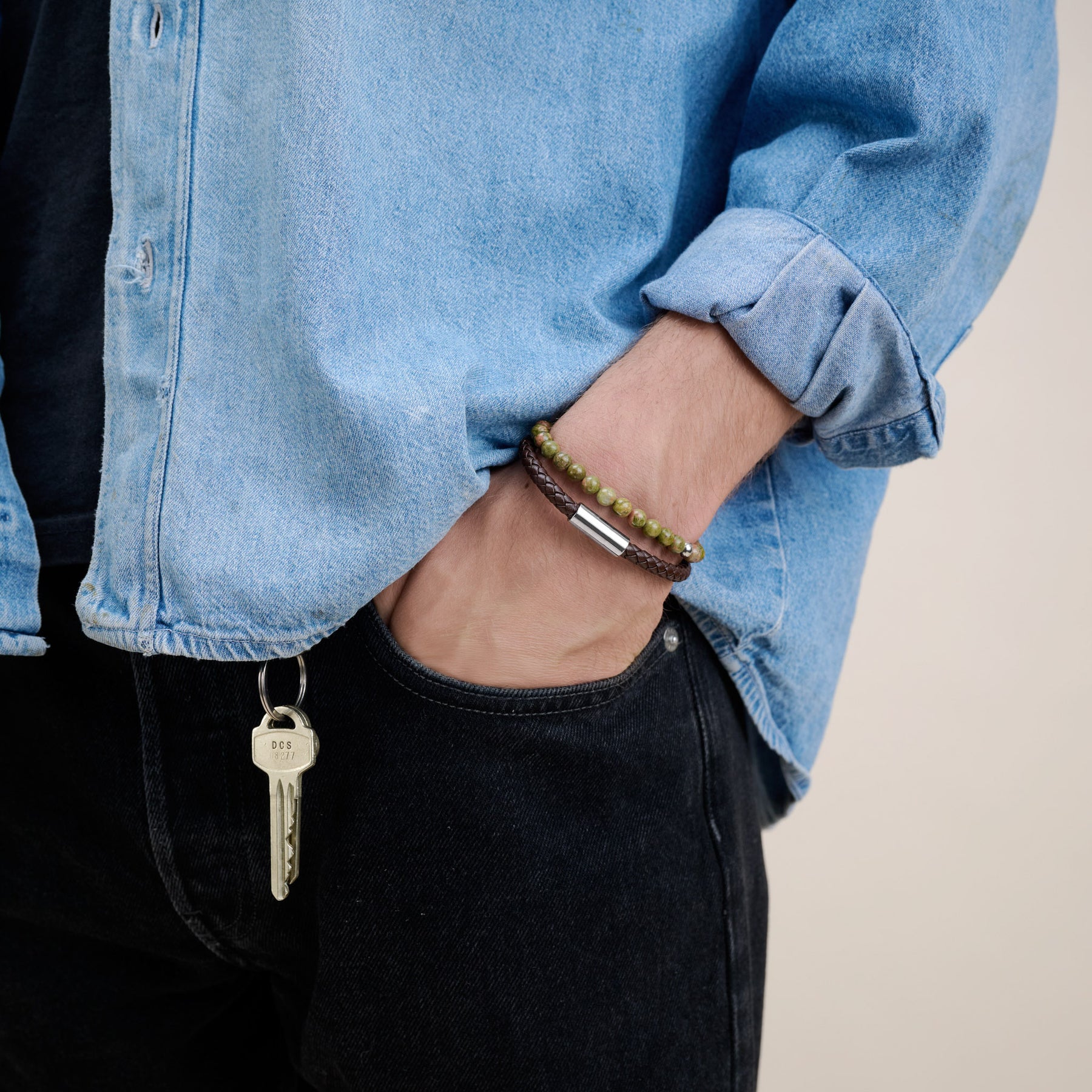 En klassisk blanding av materialer med dette lærarmbåndet for menn. Dette armbåndet kombinerer slitesterkt mykt lær med rustfrie ståldetaljer for et tidløst og allsidig utseende.