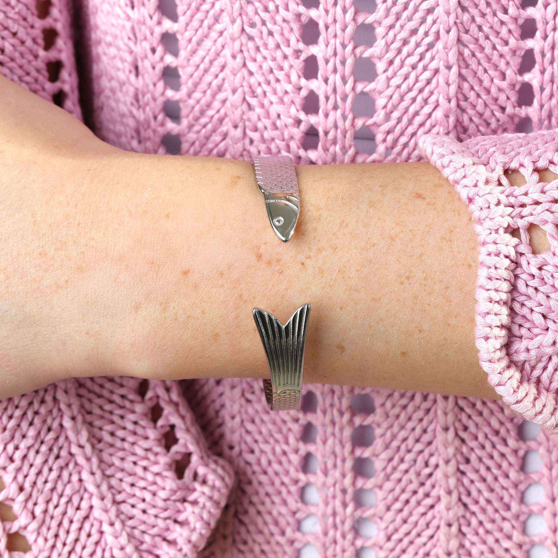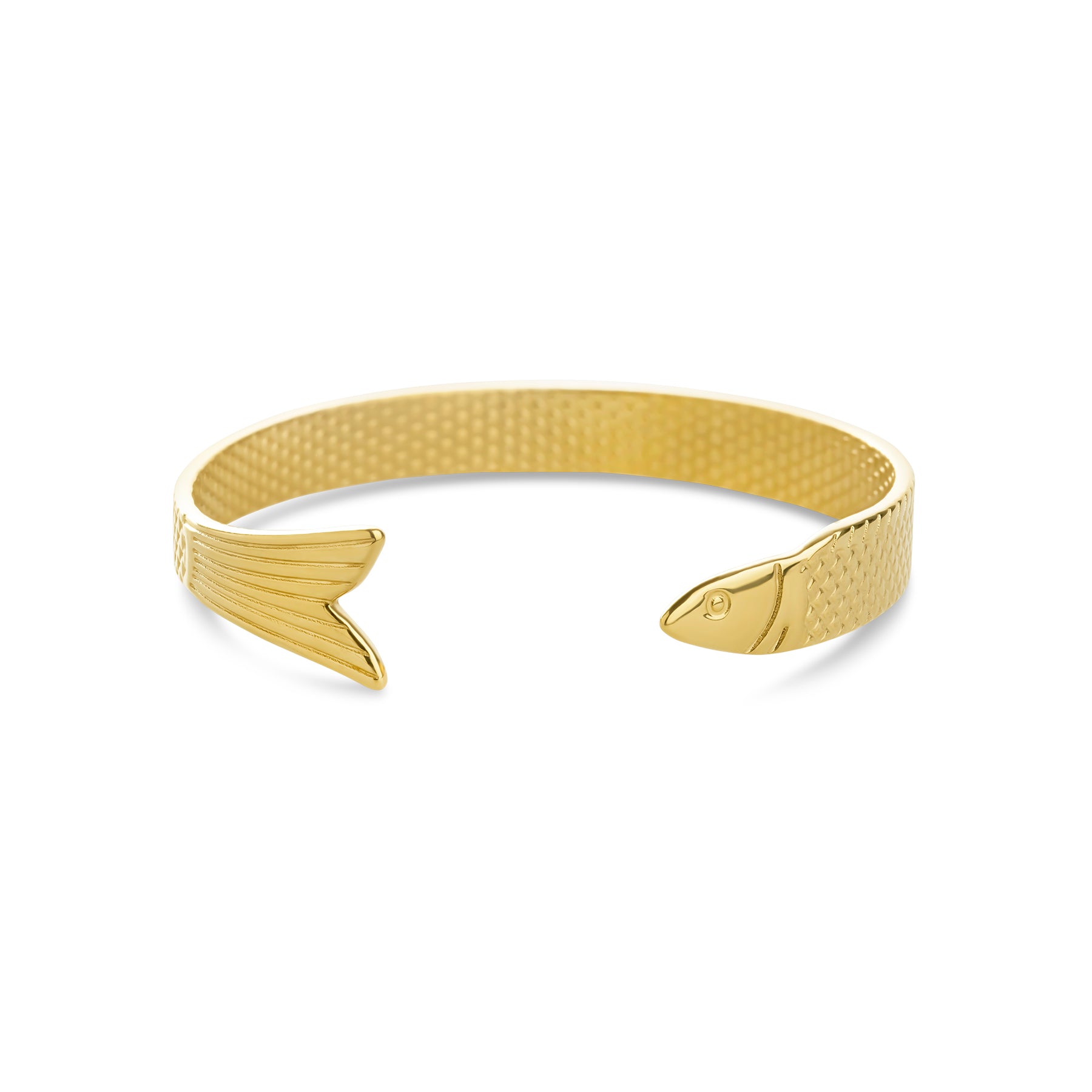 Et fiskedetaljert armring i waterproof rustfritt stål. Tilgjengelig i sølv og gull.