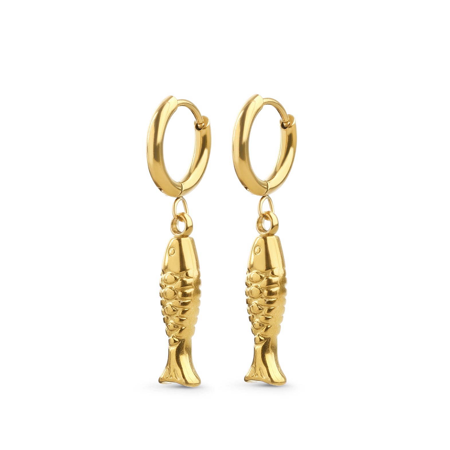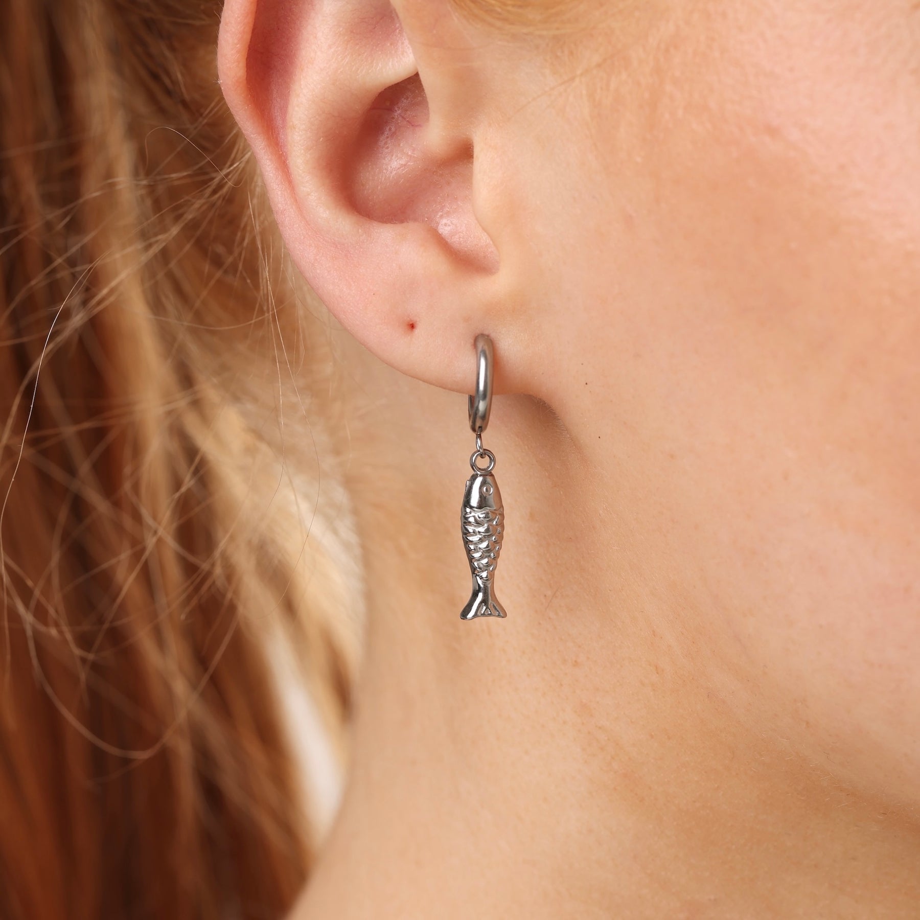 Fiskehoops / charm hoops. Små hoops med en leken fiskedetalj. Hverdagslige, men morsomme.