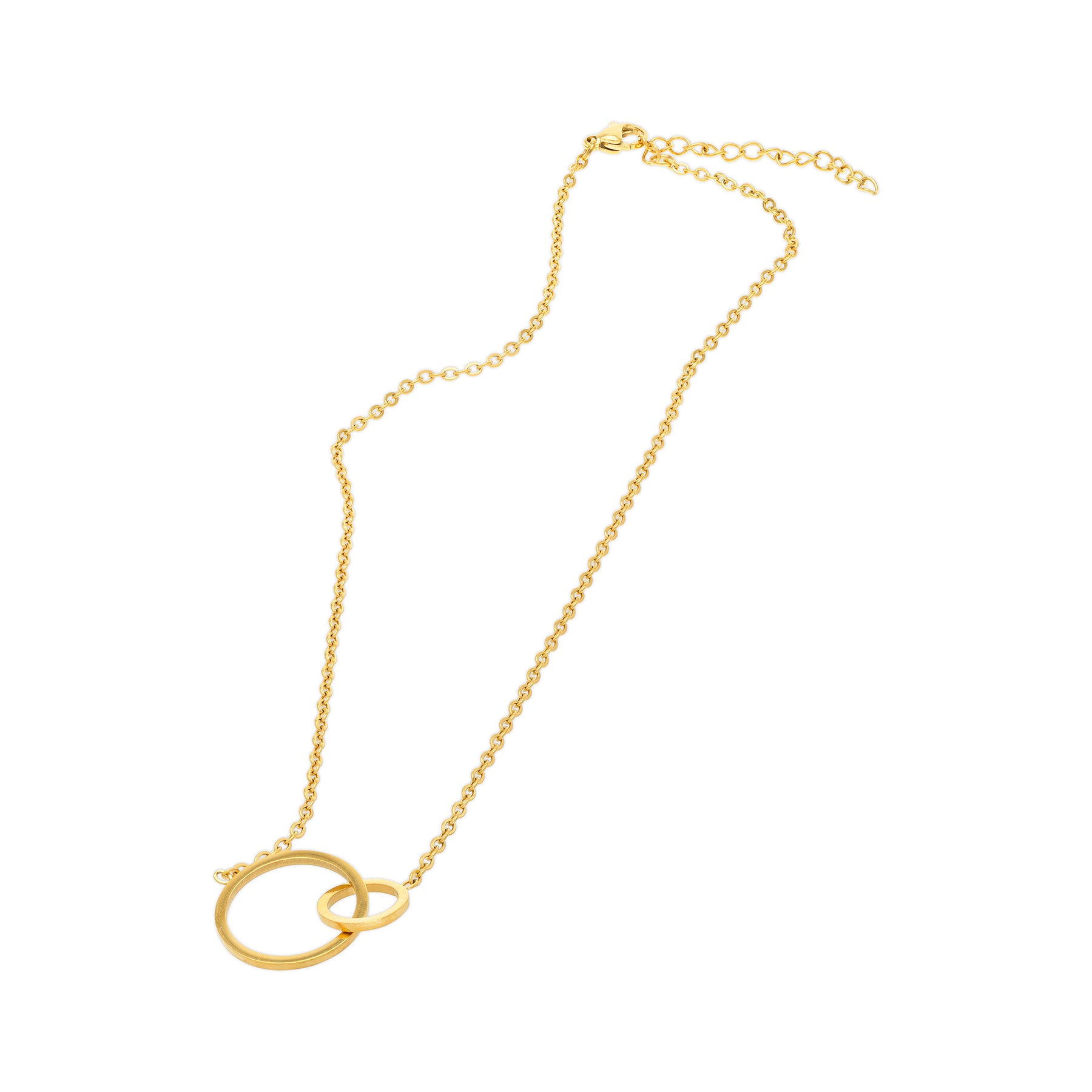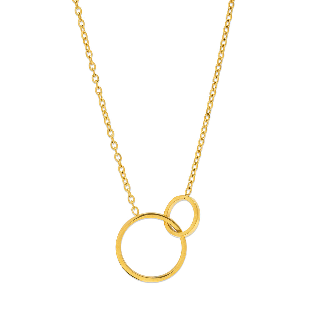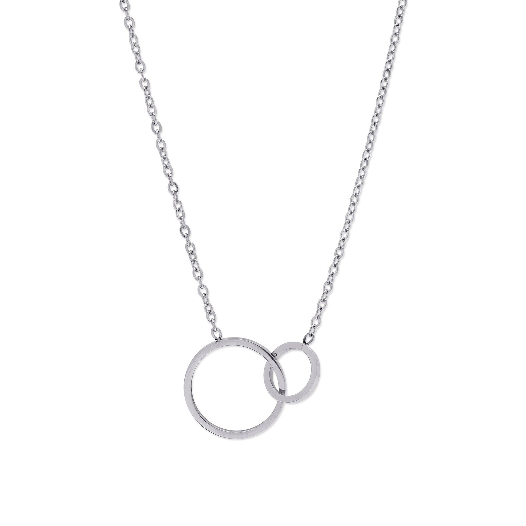 Moderne og symbolsk sirkelkjede. Dette rustfrie stålkjedet har elegante sammenlåste sirkler, er vannavstøtende, og motstandsdyktig mot misfarging for en moderne eleganse. Tilgjengelig i sølv & gull for å passe din stil og dine behov.